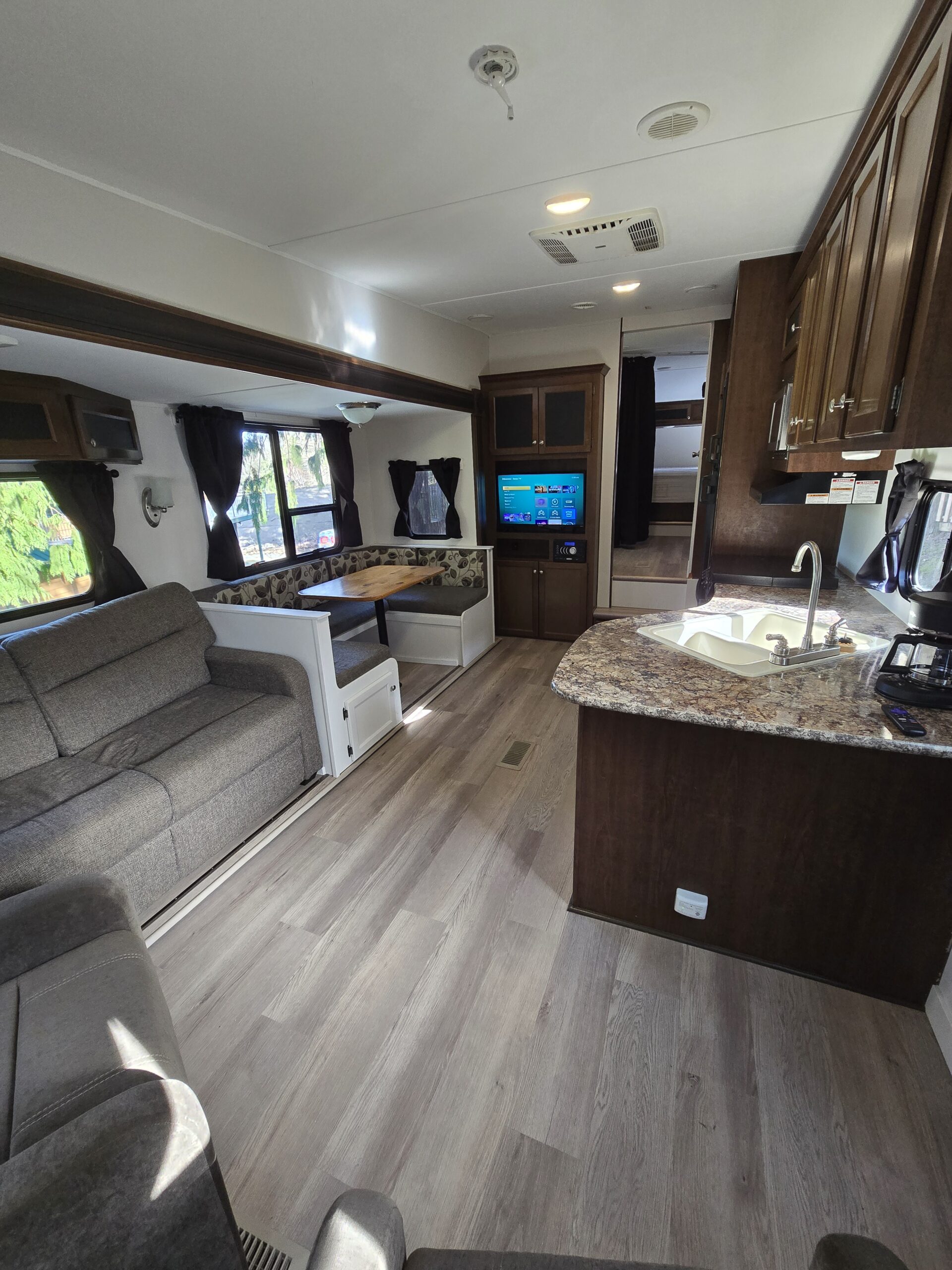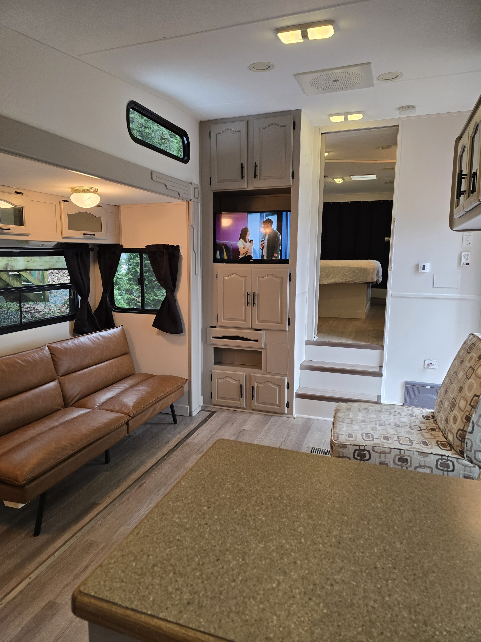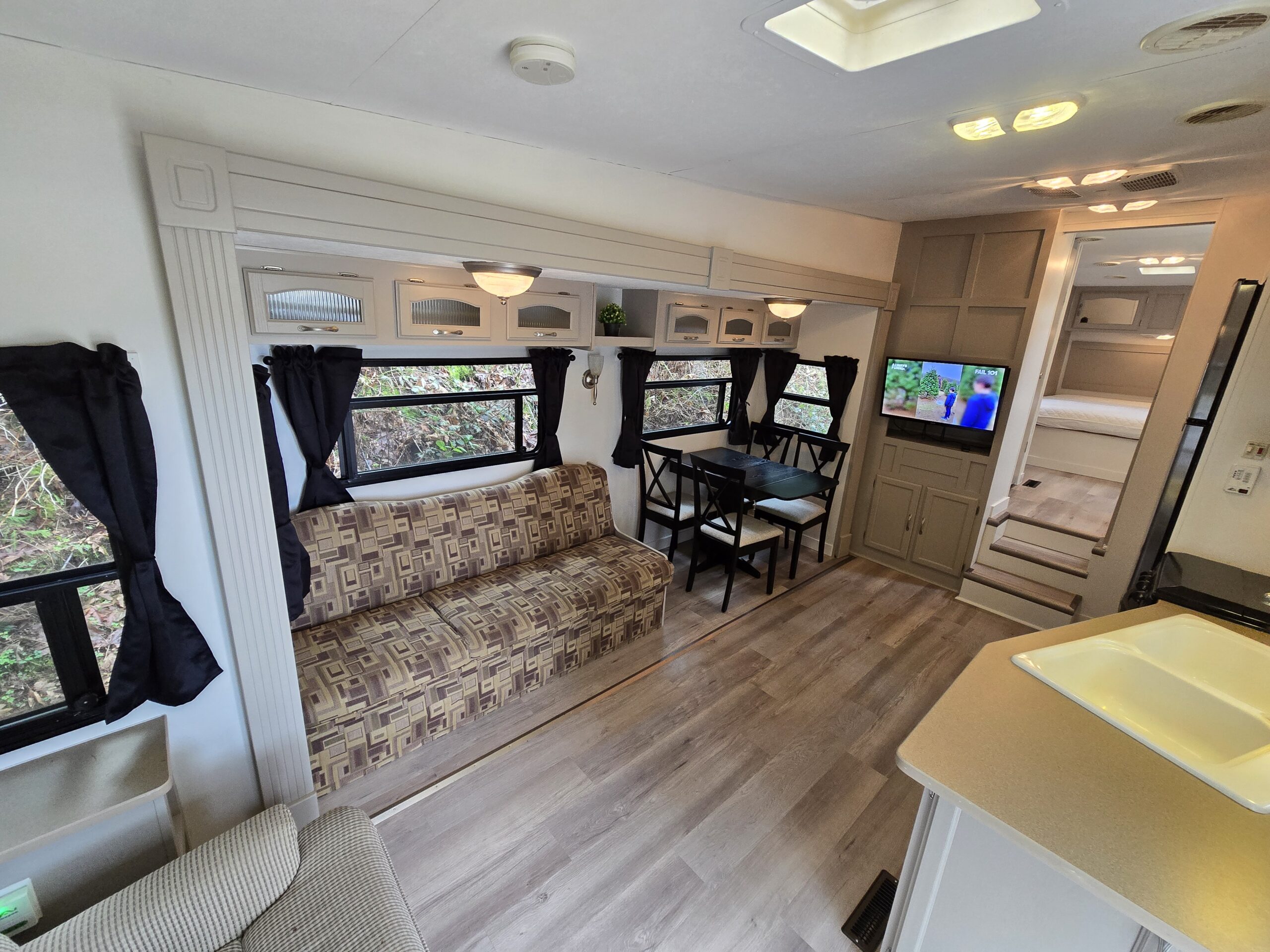 Each RV features a living area with a TV, providing a perfect spot to unwind after a day of adventures.