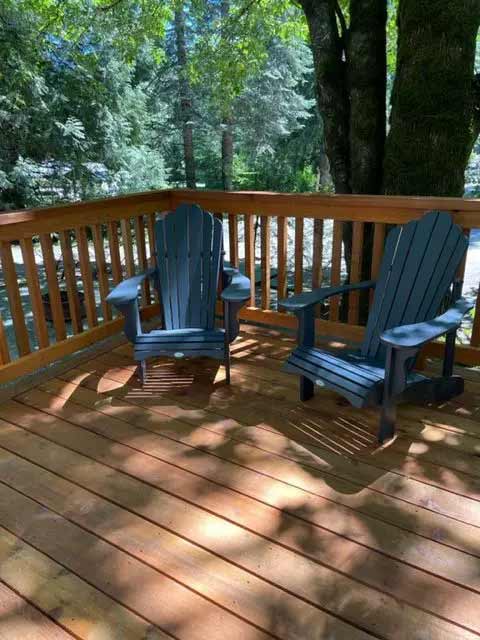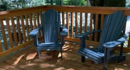 A large deck with Adirondack chairs and a BBQ, alongside a wood-burning firepit for those chilly evenings.