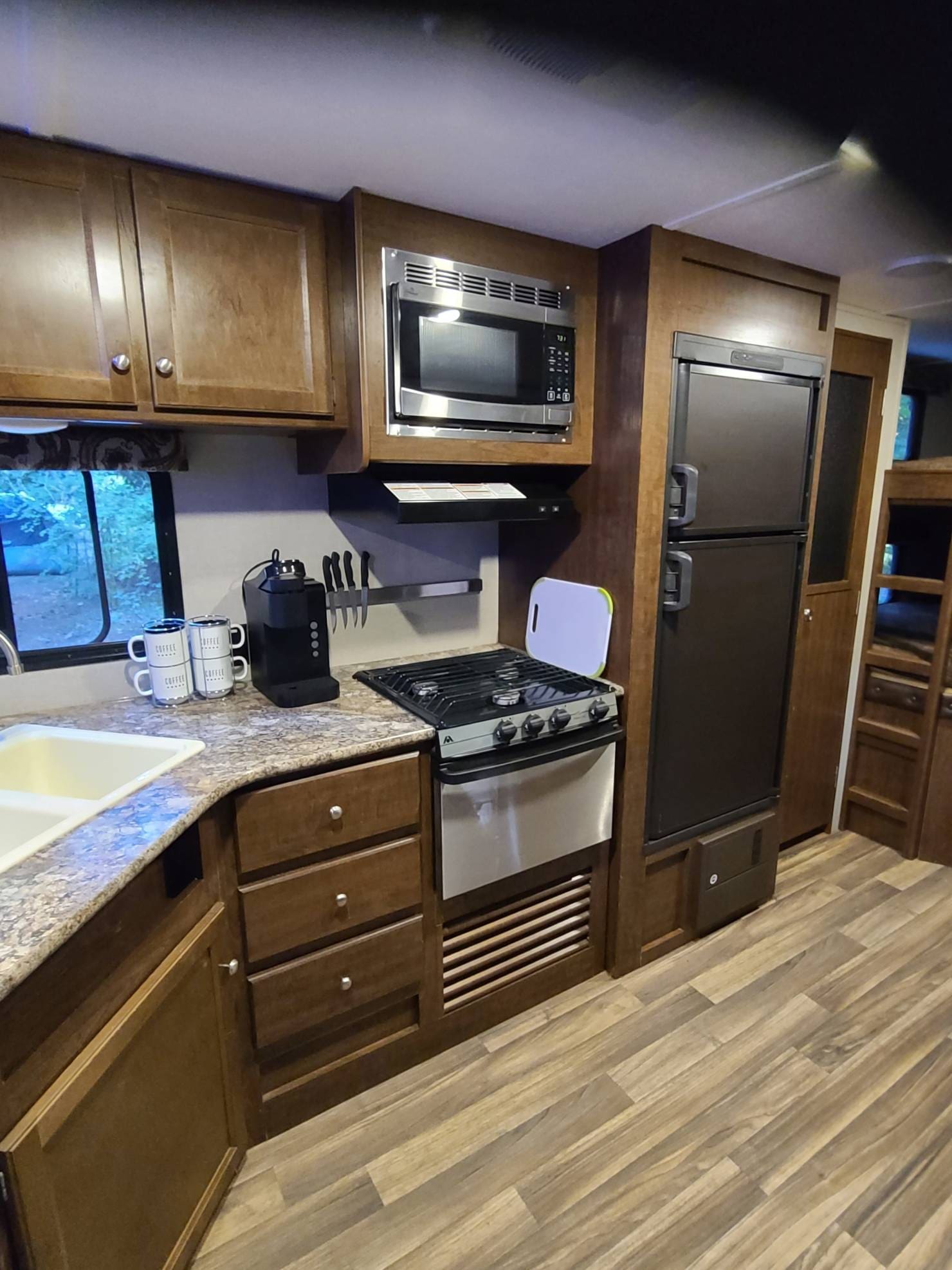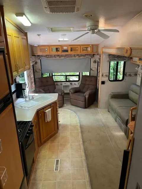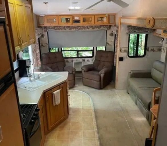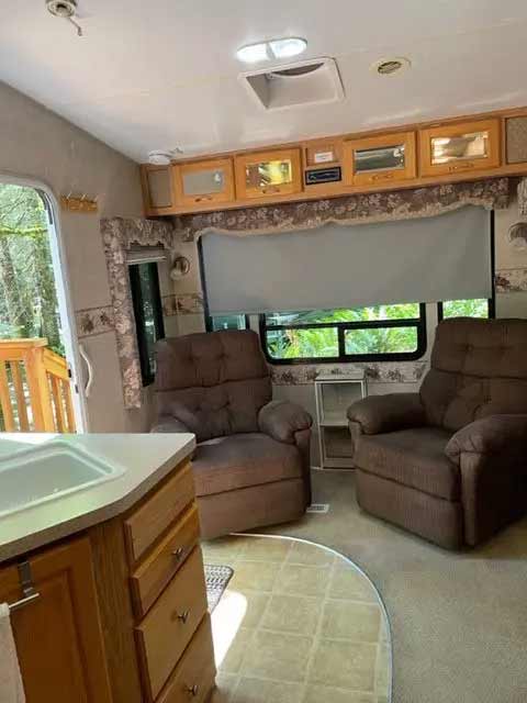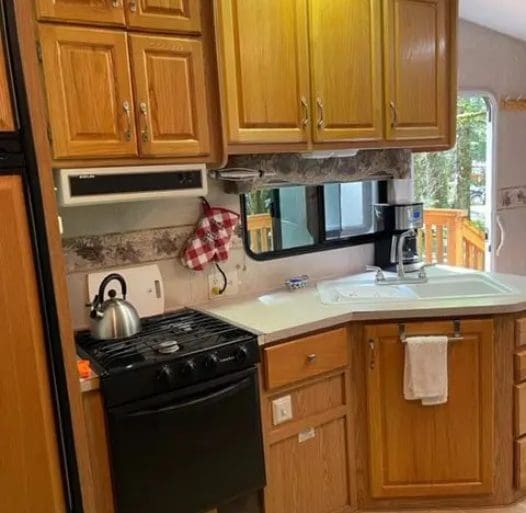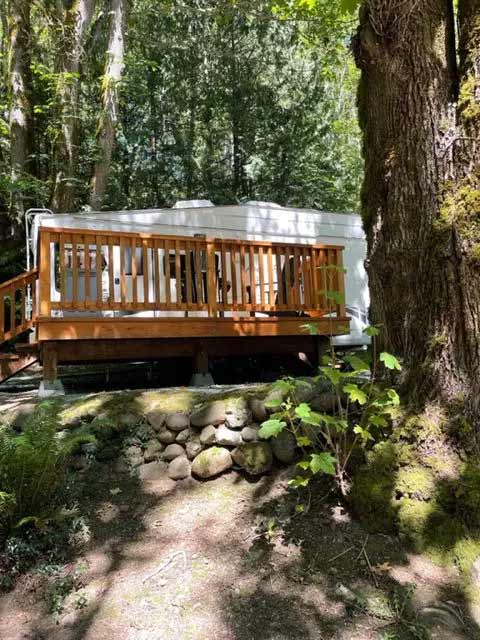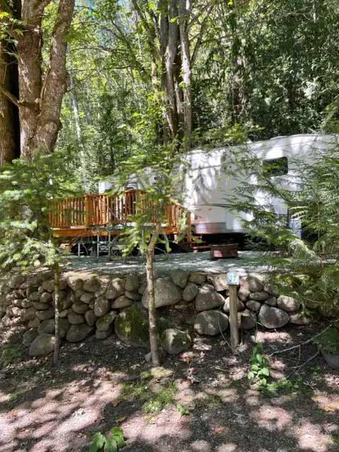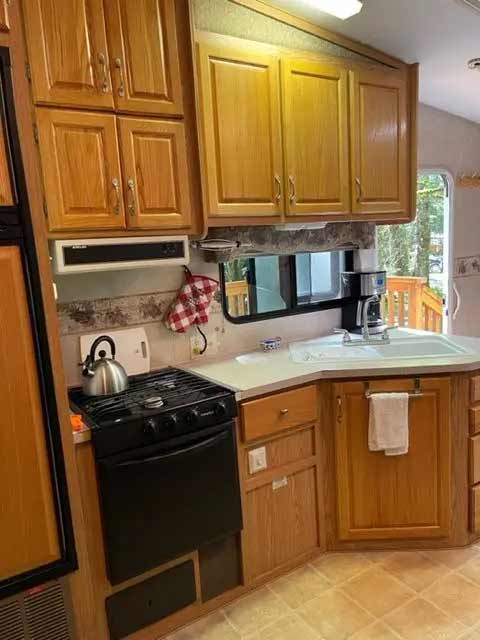 Yes, we have several RVs available for rent, equipped with full kitchens, cozy living areas, and decks with BBQs and firepits.