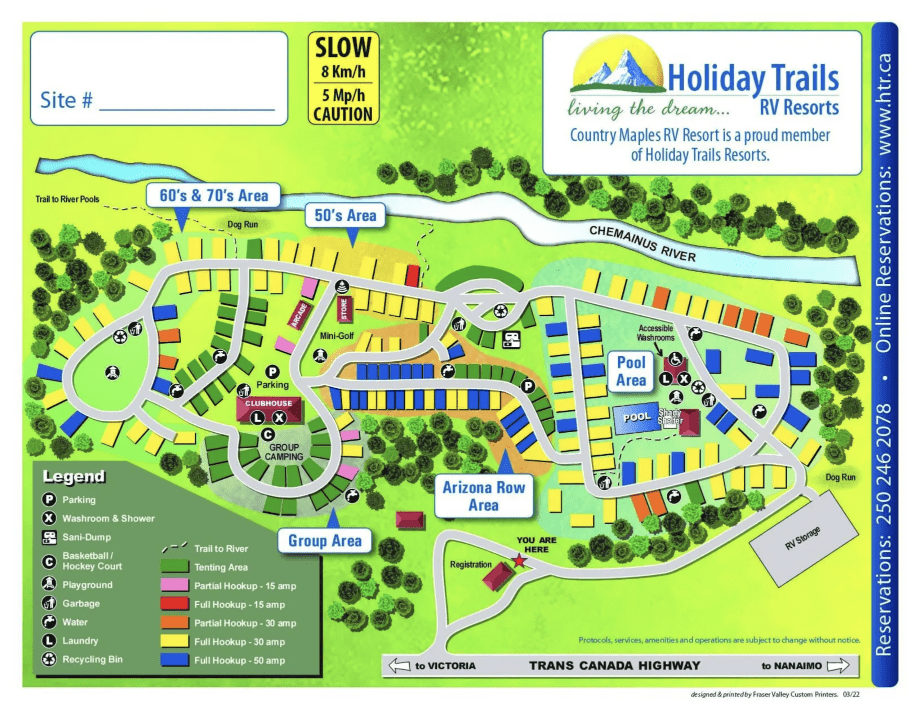 Tucked along the tranquil Chemainus River and bordered by majestic old-growth forests, Country Maples RV Resort is your year-round sanctuary. Located just a short drive from the charming town of Chemainus and only 14 km north of Duncan, it’s not only a picturesque setting but also remarkably accessible from the US, making it an ideal spot for both peaceful retreats and thrilling adventures. Whether you’re seeking a peaceful retreat or an action-packed adventure, our resort offers the perfect backdrop for your next getaway.
